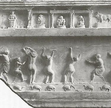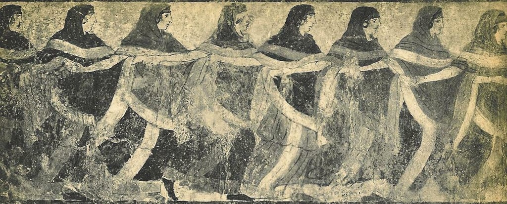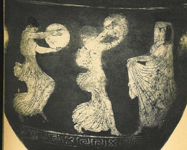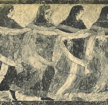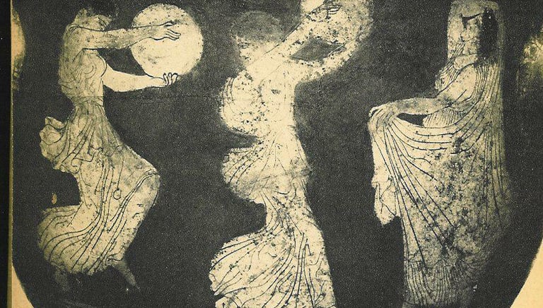 In following strong or tentative connections to and from Tarantella dances, our research came upon striking, beautiful and provocative fragments. Some of them open more questions than give answers. All of them lead to some form of festival, celebration, gathering or assembly in the territories under strong influence of ancient Hellenic culture. In the following material we enumerate, exhibit, comment and ask some questions centered around some key elements and fragments.