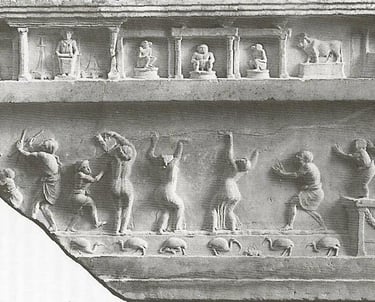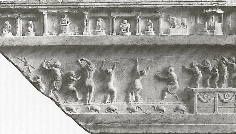 Fragment 3. Maenade Dance. In a relief from Aricia, now in the Museo delle Terme in Rome, we see a potential representation of an expressive women’s dance as a part of an assembly, perhaps in the context of a Dyonisian-Isis worship ceremony. For the scope of this paper we do not enter the intriguing and complex iconography with its Egyptian and Hellenistic elements. We include this fragment here to be a strong illustration of the presence of the “maenade type” of dance in organized gatherings of the Greco-Roman world.