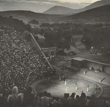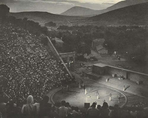 Performance of Euripides’ Hippolytos, August 1954, in the Theater at Epidaurus, from the History of the Greek and Roman Theater by Margarete Bieber