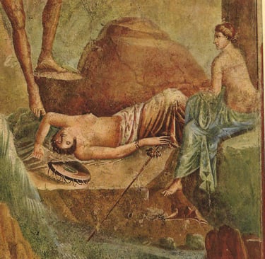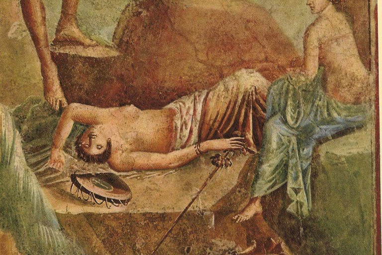 Wall painting of the Sleeping Bachanite: Baccanate Addormentata, 6th century A.D., Pompeian, Greco-Roman fresco preserved at the Museo Nacionale Di Napoli.